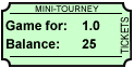To help you keep track of your account balance during a Tournament or a Mini-tourney with $Prizes, the image of a Ticket like the one below is displayed at your game table. The Ticket image like the one below is shown privately only at your game table and it has your remaining account balance (e.g., 25 $Tickets below) and also shows what the current entry fee is (e.g., 1 Ticket). Winner(s) receive $Prizes based on the percentage of combined entry fees minus a small commission (see commissions). The private chat area also describes your account transactions during all Tournaments.