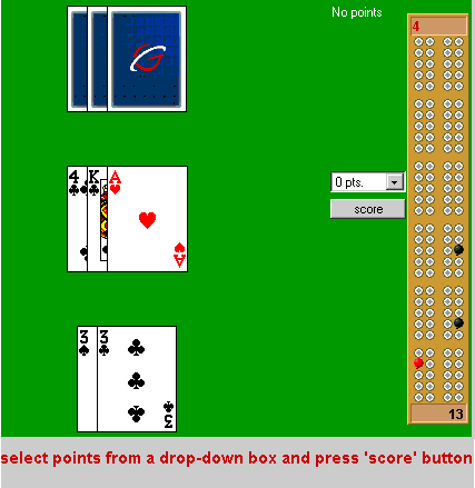 In the example below, a player just put an Ace of Hearts on the table earning 2 points (not shown). Instructions in red call for this player to select his points from the drop-down box and press the 'score' button.