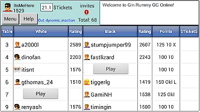 The main part of the game room screen shows players and their games. Open tables show 'Play' button.