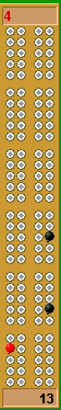 In the example of the cribbage board on the right, the score is 13:4 in your favor. The forward black peg is on the 13th hole for you & on the 7th hole for your opponent. The rear black peg for you is on the 4th hole, indicating that the previous score was: 4 for you.