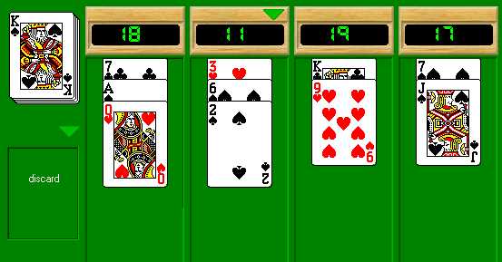 The numbers on top of each column show the current total value of the cards in that column. Picture cards (Jacks, Queens, and