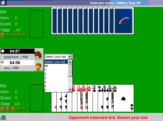 In the picture, your cards are shown open on the bottom of the table and your opponent's cards are shown closed at the top of the table. The guiding red message below the table reports that opponent's bid has already been selected. Table options (see details below) on top of the window show default options: 5 min per move, 300 pt total needed and Bag-50 option (-50 pt penalty for 5 bags). The scores in the picture show that "you" have 63 points and 3 used bags (shown in brown) while "opponent" has negative 41 points and 1 bag.